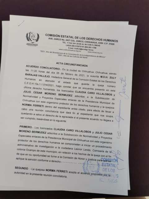 Tras recibir la queja, la CEDH Chihuahua convocó a las partes involucradas a una reunión conciliatoria, asistiendo como enlaces de la Presidencia Municipal de Chihuahua Claudia Caro Villalobos y Julio César Moreno Bermúdez, adscritos a la Subdirección de Normatividad y Proyectos Especiales, quienes se comprometieron, “a iniciar un procedimiento administrativo de investigación a la ciudadana Leonor Lendo, comisaria de la colonia Ocampo con el fin de que en su oportunidad se turne a la Comisión de Honor y Justicia para que se aplique la sanción conforme a derecho”.
