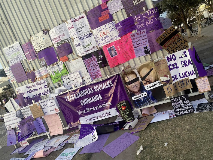 Previo al día, previo a la marcha, la decisión gubernamental y municipal de amurallar y cerrar las calles revivió el debate, calentando los ánimos de las colectivas y movimientos que cuestionaron de forma rotunda la decisión bloquear el acceso a dos símbolos de la exigencia de justicia ante los feminicidios: la ‘Cruz de clavos’ y la placa que señala el lugar del asesinato de la activista Marisela Escobedo, “la gobernadora de Chihuahua secuestra la ‘Cruz de clavos’ con vallas metálicas, sitio emblemático donde históricamente el Movimiento Estatal de Mujeres conmemora el 8 de Marzo, Día Internacional de las Mujeres”.
