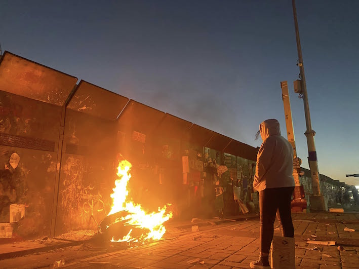 Y luego el humo comenzó a aparecer, una fogata alimentada con cables tomaba fuerza e iluminaba de forma espectral el acero que impedía el libre tránsito a las manifestantes.