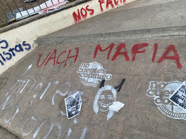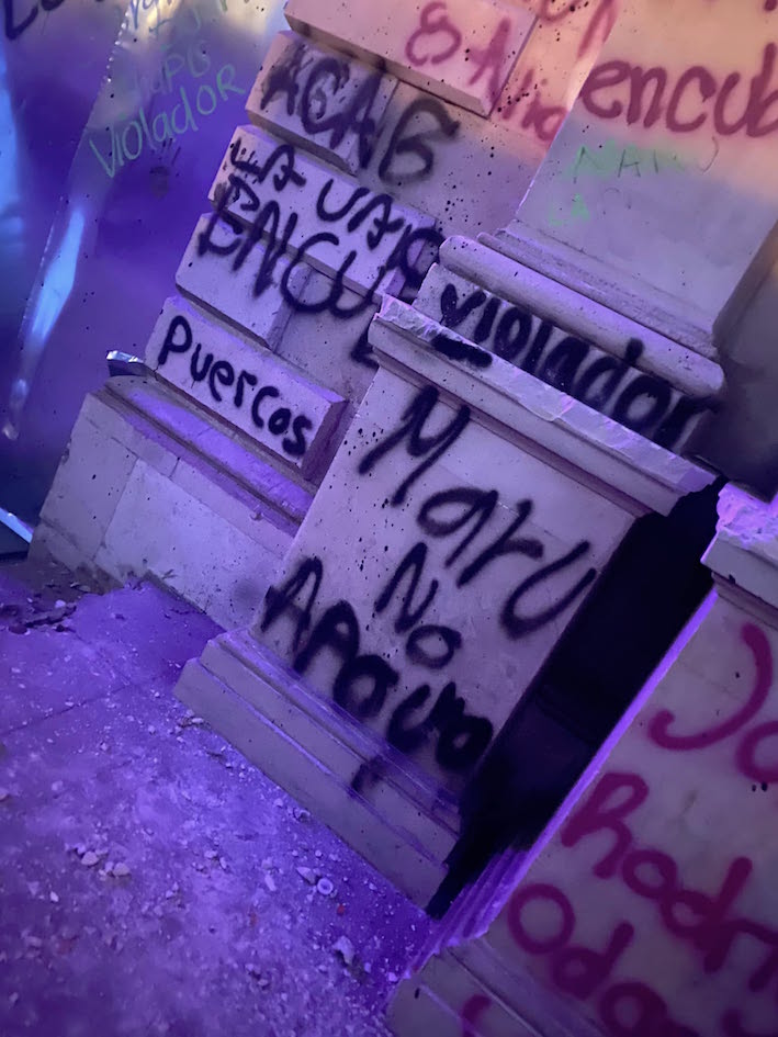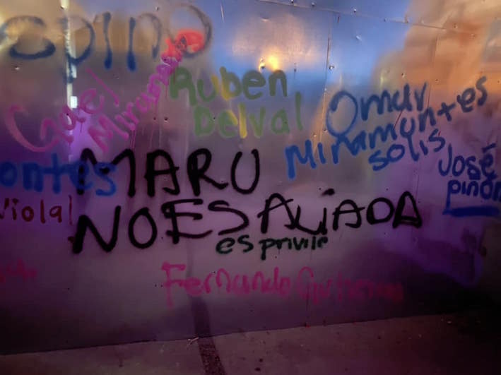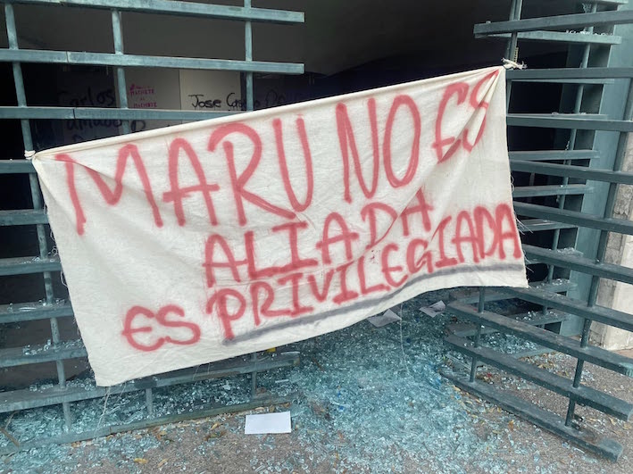 —También aumentaron los gritos y pintas en contra de la gobernadora de Chihuahua, María Eugenia Campos, ‘no cuentes conmigo’, ‘Maru no apoya’ y una enorme manta con la leyenda ‘Maru no es aliada, es privilegiada’ a la entrada de la “Rotonda de los chihuahuenses ilustres”, debajo de la estatua del Ángel, además de pintas en su interior.