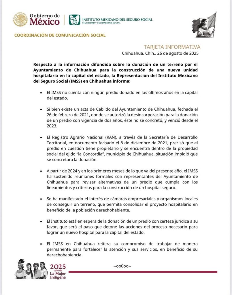 Además, “a partir de 2024 y en los primeros meses de lo que va del presente año, el IMSS ha sostenido reuniones formales con representantes del Ayuntamiento de Chihuahua para revisar alternativas de un predio que cumpla con los lineamientos y criterios para la construcción de un hospital seguro”.