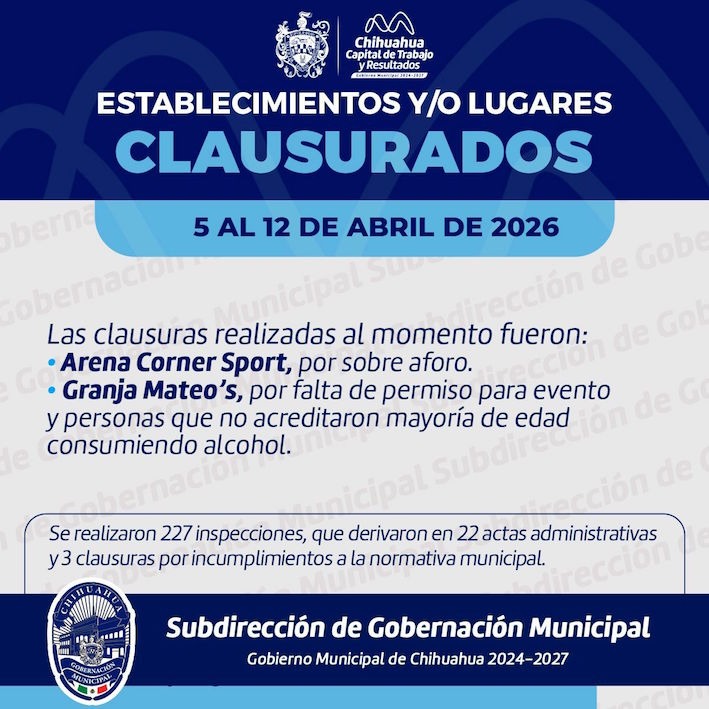 Chihuahua, Chih.- El Gobierno Municipal de Chihuahua a través de la Subdirección de Gobernación de la Secretaría del Ayuntamiento dio a conocer que la Arena Corner fue clausurada tras el concierto de Yuri por sobreaforo, sobreventa y violación al programa especial de Protección Civil.