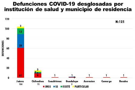 En cuanto al desglose de defunciones por municipio e institución médica. Juárez: 61 en el IMSS, 28 en el Sector Salud, 12 en el Issste y 3 en particular; Chihuahua, 9 en el IMSS, 1 en Sector Salud, 2 en el Issste, 3 en particular; Cuauhtémoc: 1 en el IMSS; Guadalupe, 1 en el IMSS y 1 Sector Salud; Ascensión, 1 en el IMSS; Camargo, 1 en el IMSS y Rosales 1 en el IMSS.