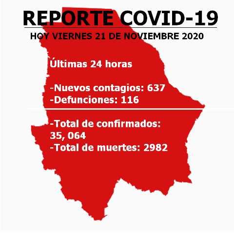 Chihuahua, Chih.- A pesar de que hoy, el gobernador de Chihuahua anunció que las estadísticas en Chihuahua van a la baja, tras el estado de cero movilidad y megacierres, la Secretaría de Salud reportó el fallecimiento de 116 personas en las últimas 24 horas, así como 637 nuevos contagios, con lo que la entidad alcanza un total general de 2 mil 982 decesos y 35 mil 064 casos confirmados desde que inició la enfermedad, lo que indica que lo dicho por Javier Corral no concuerda con los números.
