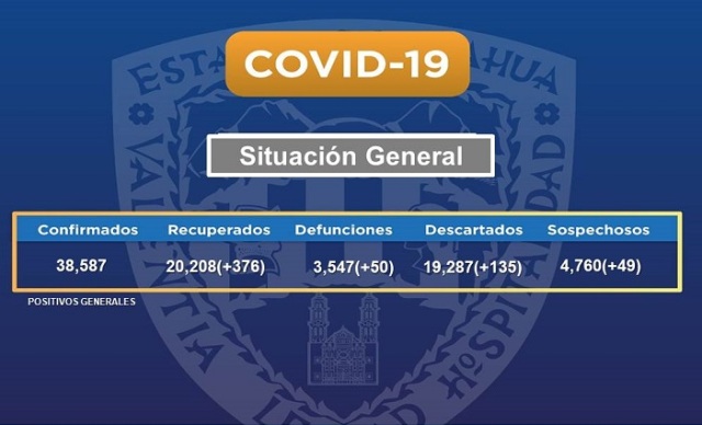 Chihuahua, Chih.- Hoy miércoles, la Secretaría de Salud confirmó 295 nuevos contagios y 50 defunciones por COVID-19 en las últimas 24 horas, con lo que se tiene en el estado un total de 38,587 casos acumulados, de los cuales el 51 % son en personas del sexo masculino (19,791) y 49 % del femenino (18,796) y, 3 mil 547 muertes.