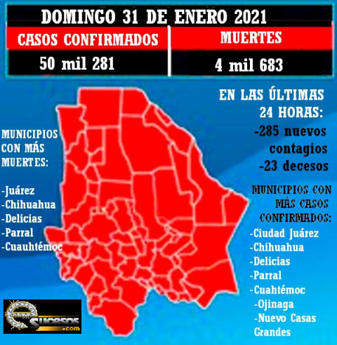 Chihuahua, Chih.- Hoy domingo, en el lapso de las últimas 24 horas, el estado de Chihuahua alcanzó los 50 mil 281 casos confirmados de COVID-19 y las defunciones llegaron a las 4 mil 683, al registrarse 285 nuevos contagios y 23 decesos.