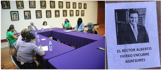 Las manifestantes demandaron a la implementación de más políticas universitarias para prevenir el hostigamiento y el acoso sexual, además de acusar al rector Luis Alberto Fierro Ramírez de ‘encubrir agresores’, además de exigirle que, ‘queremos espacios libres de violadores’.