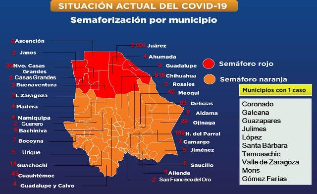 Los casos confirmados: 2,001 Juárez, 816 Chihuahua, 6 Bachíniva, 43 Cuauhtémoc, 29 Ojinaga, 4 Namiquipa, 42 Meoqui, 1 Julimes, 7 Camargo, 6 Saucillo, 4 Ahumada, 2 Guadalupe D.B., 14 Guachochi, 83 Delicias, y 6 Ascensión, 2 Guerrero, 7 Bocoyna, 4 Madera, 109 Parral, 3 Buenaventura, 1 Temósachi, 1 Galeana, 4 Guadalupe y Calvo, 35 Nuevo Casas Grandes, 2 Rosales, 5 Jiménez, 2 Aldama, 1 Santa Bárbara, 2 Ignacio Zaragoza, 1 López, 5 Urique, 2 Janos, 2 San Francisco del Oro, 1 Guazapares, 4 Allende, 1 Coronado, 1 Valle de Zaragoza, 2 Casas Grandes, 1 Moris y 1 Gómez Farías. Además se agregó Chínipas en el muestreo masivo.