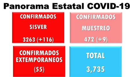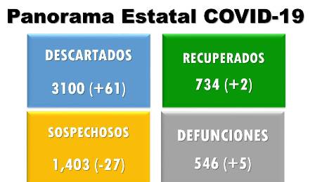 También se presentaron 5 nuevas defunciones para llegar a 546 en la entidad, así como un total de 3,263 positivos hasta el momento.