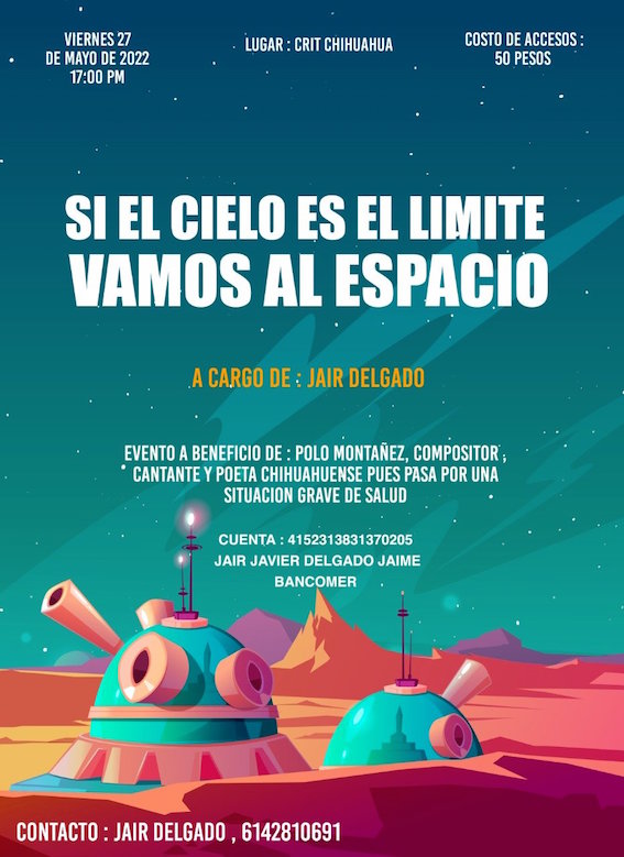 Por ello, en solidaridad, Jair Delgado ofrecerá el próximo viernes 27 de mayo a las cinco de la tarde, la conferencia ‘Si el cielo es el límite, vamos al espacio’ en las instalaciones del CRIT Chihuahua, con un costo de acceso de 50 pesos, lo recabado será donado a Polo Montañez.