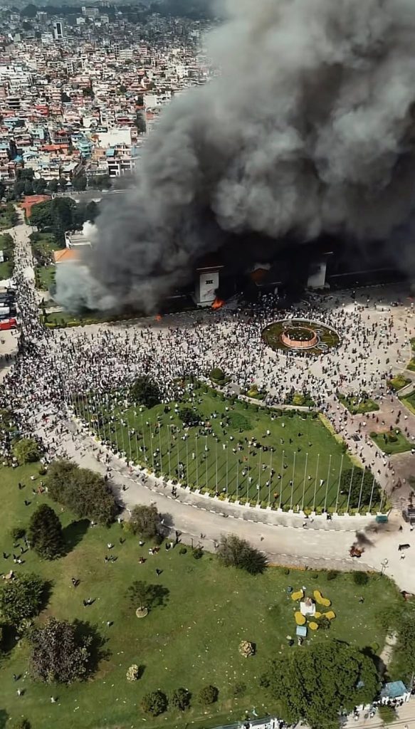 Nepal, Katmandú- Las grandes multitudes de jóvenes que se manifiestan desde el lunes en Nepal crecen a pesar del toque de queda impuesto por el gobierno y exigen poner fin a la arraigada corrupción de la élite política del país y la falta de oportunidades económicas, especialmente el empleo, deja un rastro de destrucción sistemática.