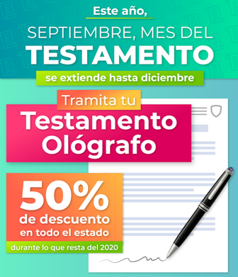 Chihuahua, Chih.- Para reducir al mínimo los riesgos de contagio y garantizar que un mayor número de personas realicen su testamento ológrafo, el descuento del 50% en el trámite como parte de la campaña “Septiembre, mes del testamento”, se mantendrá lo que resta de este 2020.