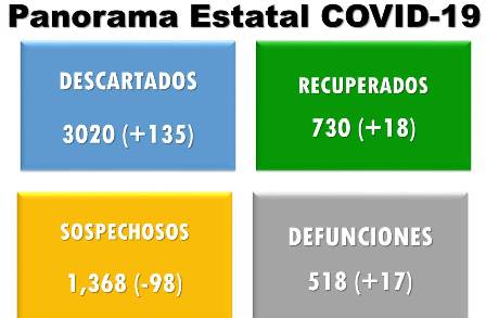Subió en 18 las personas recuperadas para un total de 730, 135 descartados para 3,020 y 98 sospechosos para 1,368.
