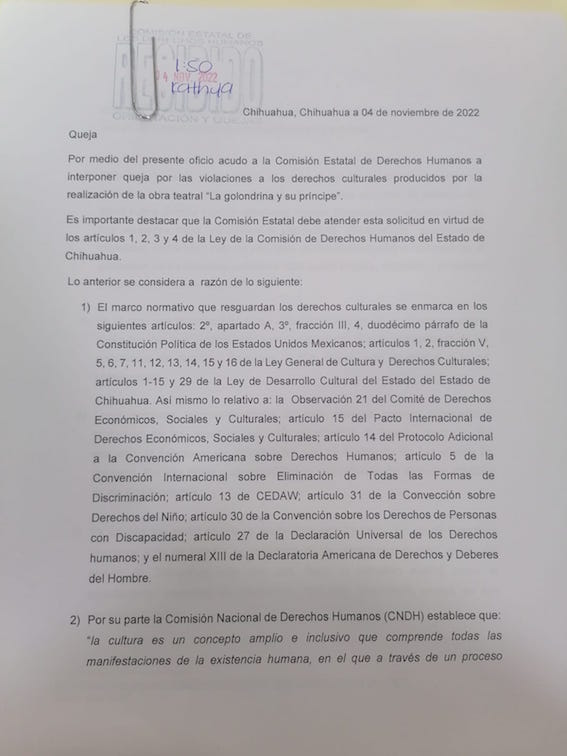 Chihuahua, Chih.- El colectivo ‘Artistas, creadores y ciudadanía vigilante’ presentó oficialmente ante la Comisión Estatal de Derechos Humanos, CEDH, en las oficinas regionales de Chihuahua capital y Ciudad Juárez, una queja en contra de los gobiernos estatal y municipal por la falta de transparencia al adjudicar directamente cerca de 35 millones de pesos para el montaje de la obra ‘La golondrina y su príncipe’ a la empresa AEFE Producciones de Alberto Espino y Federico Elías.