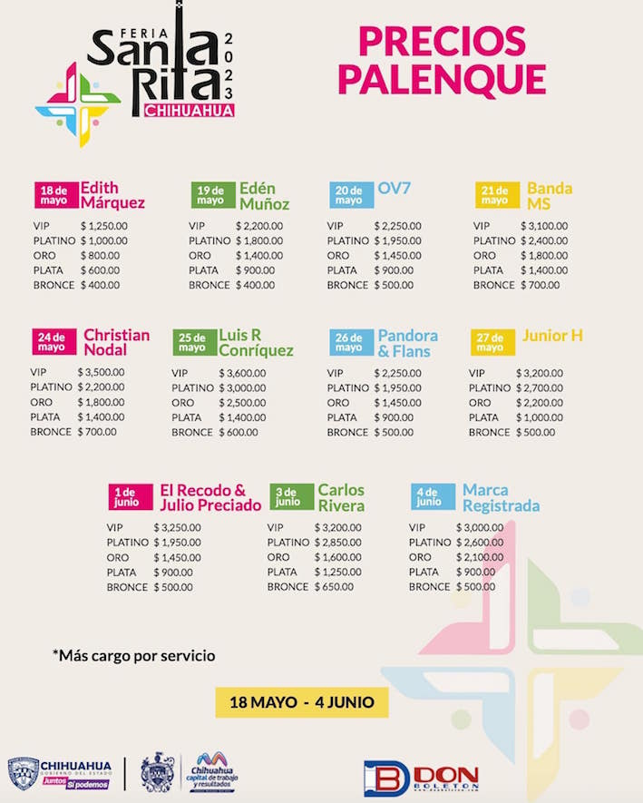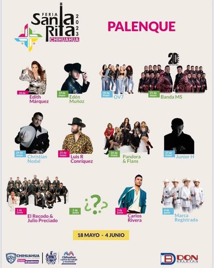 Chihuahua, Chih.- Figuras de la música como Edith Márquez, Eden Muñoz, OV7, Christian Nodal, Luis R. Conríquez, Pandora/Flans, Junior H, Carlos Rivera y Marca Registrada se presentarán en el redondel de la Feria de Santa Rita 2023, que se desarrollará en la capital del estado del jueves 18 de mayo al domingo 4 de junio, informaron los organizadores.